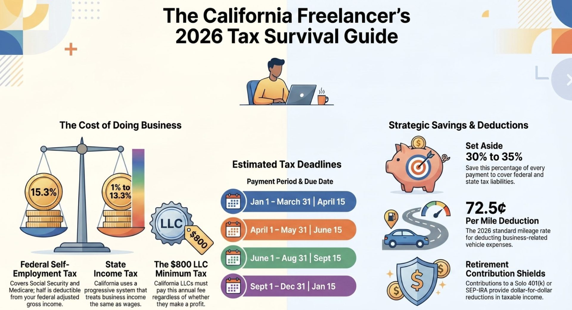For a self-employed Californian earning $100,000 in net income after deductions, the combined federal self-employment tax, federal income tax, and California state income tax can easily exceed 40% of earnings. This makes tax planning and deduction optimization absolutely critical in California.