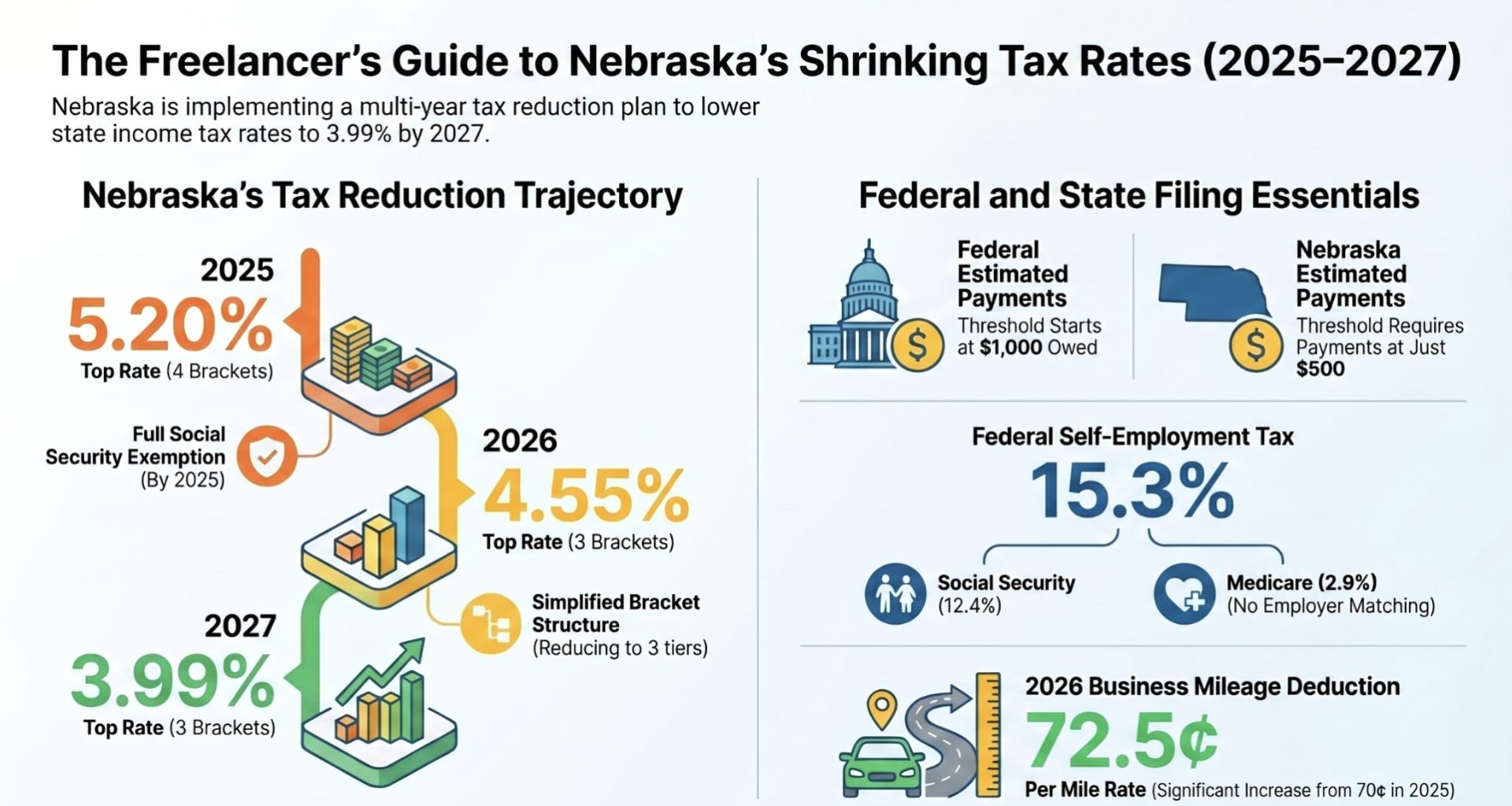 Nebraska self-employment tax has been getting more favorable every year, and working with independent professionals across the Great Plains has given me a front-row seat to this evolving tax landscape. Nebraska is in the middle of an aggressive multi-year tax reduction plan bringing rates down from over 6% to an eventual 3.99% by 2027, with a major step happening in 2026 when the top rate drops to 4.55% and the bracket structure simplifies from four tiers to three. For freelancers and independent contractors in Omaha, Lincoln, and across the state, these changes represent real good news. Understanding how they interact with your federal self-employment tax obligations can help you plan ahead and keep more of what you earn.